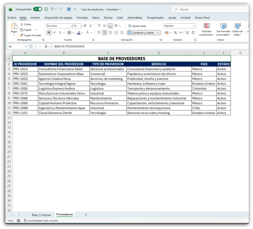 Para lograrlo, la empresa consolida toda la información en una hoja principal llamada Base_Compras y crea una hoja adicional llamada Proveedores, con los campos que se muestran en la siguiente imagen: